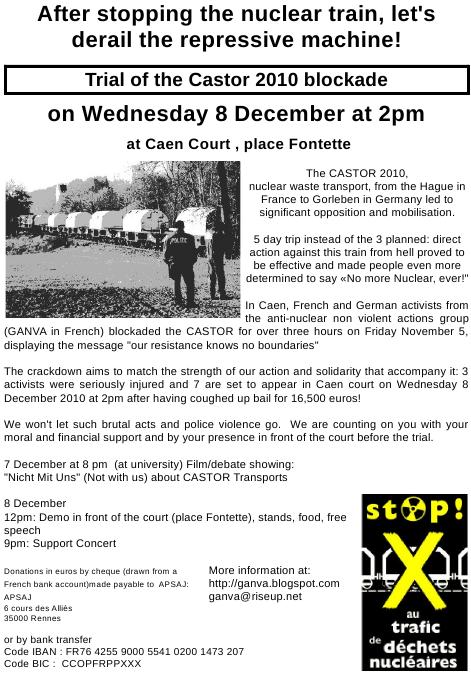 Le 8 décembre 2010 a eu lieu à Caen le procès de 7 personnes du Ganva. Ce procès concernait l’action de blocage du train “Castor” 2010 qui avait eu lieu à Caen le 5 novembre 2010.